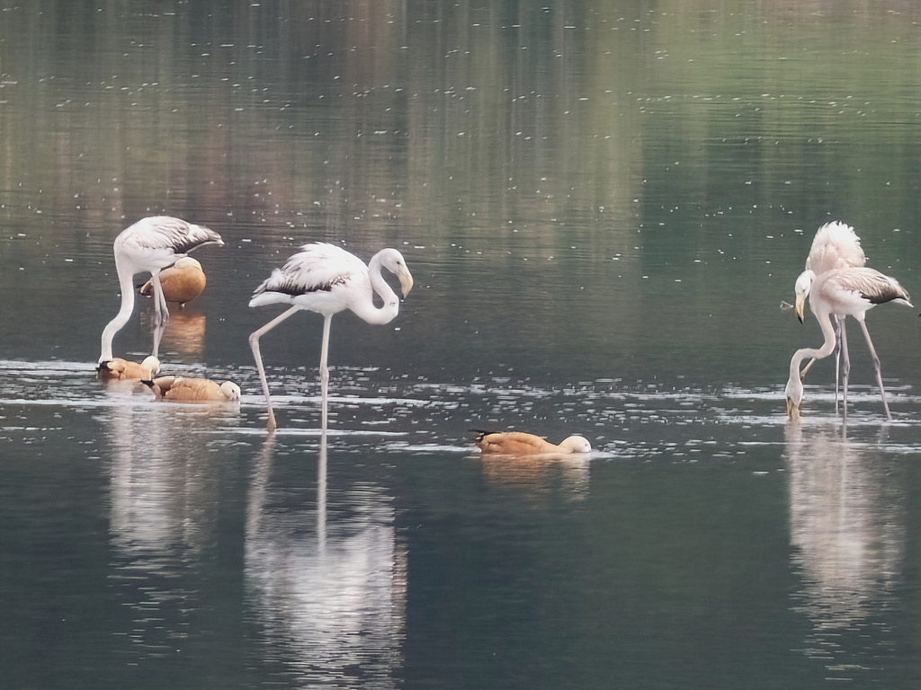 L’île du grand étang est submergée. Seul le nid d’une foulque persiste à son sommet. Deux aigrettes garzette au loin, une couple d’oies cendrées avec leur trois fistons.