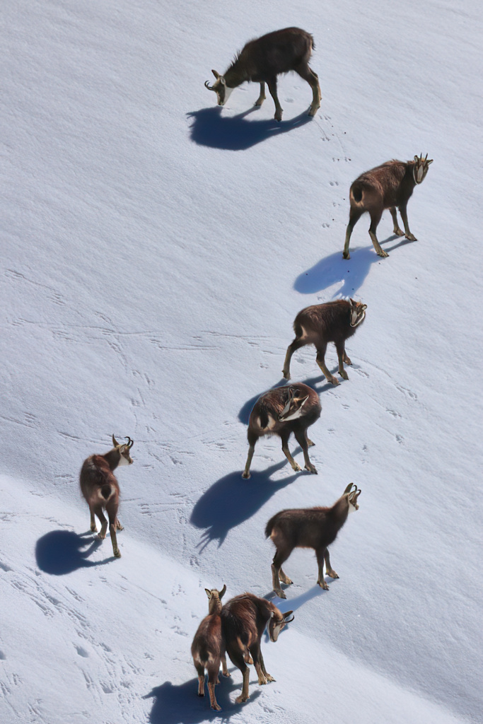 Le soleil va bientôt disparaître aux abords du lac de Joux. Entre forêts et pâturages, nous apercevons un grand groupe de chamois, des femelles et des jeunes.