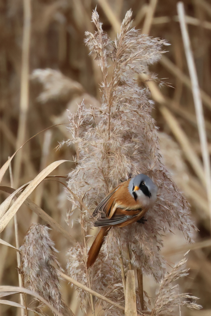 Nous ne l’avions vue qu’en volière. Voilà qu’un beau jour un mouvement dans les roseaux bordant la digue attire notre attention. Un couple de panures à moustaches s’agite devant nous, à quelques mètres. Deux longues minutes du pur bonheur.